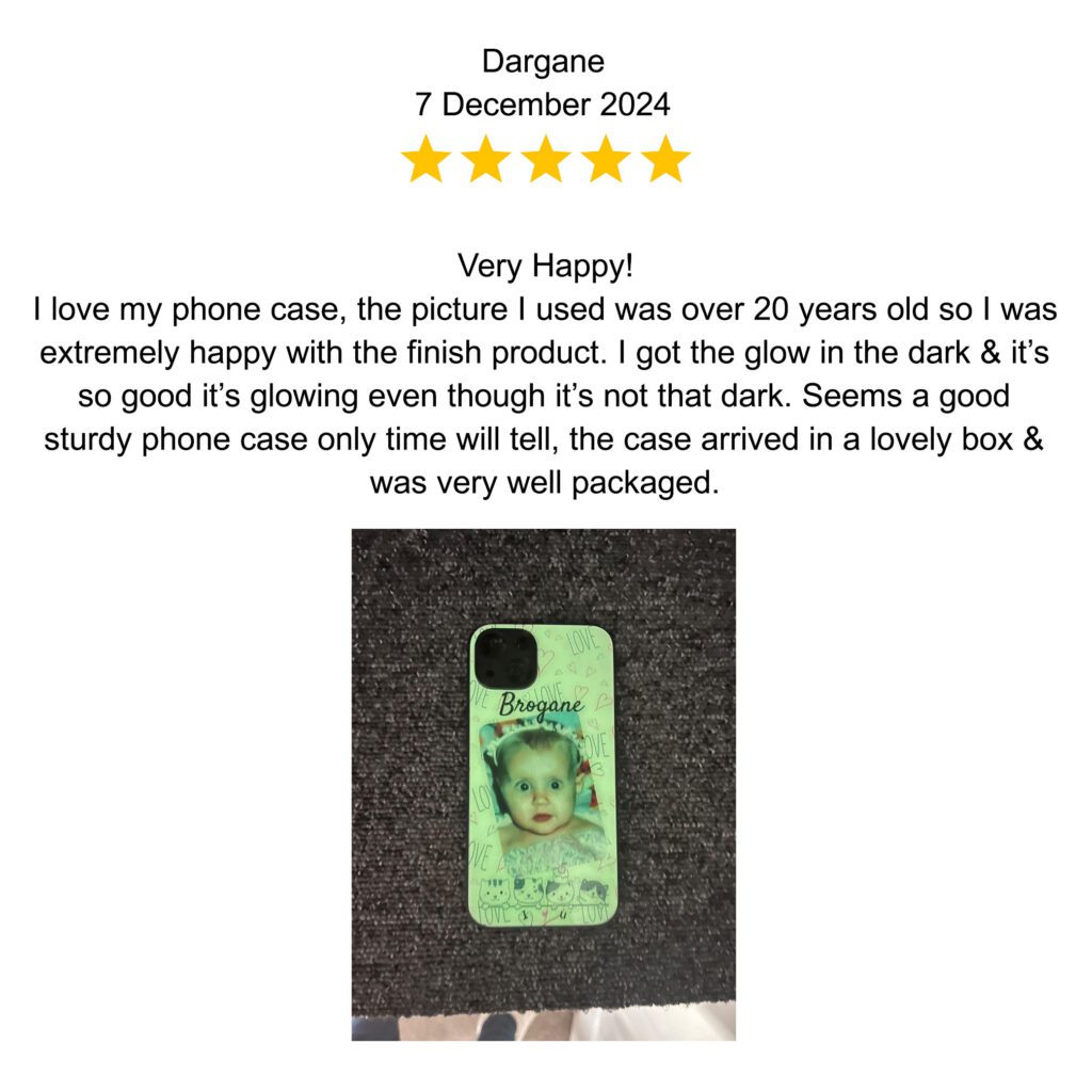 Personalise Your Phone Cases with Optional Luminous Glow in the Dark. Available in our popular Tempered Glass Cases